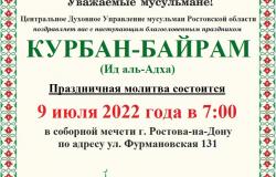 Уважаемые братья и сестры! Центральное духовное управление мусульман Ростовской области поздравляет вас с наступающим благословенным праздником Ид аль-Адха  "Курбан-Байрам" и сообщает, что праздничное Богослужение, Инша Аллах состоится 9 июля 2022г. в 7:00 в соборной мечети г. Ростова-на-Дону по адресу ул. Фурмановская 131.